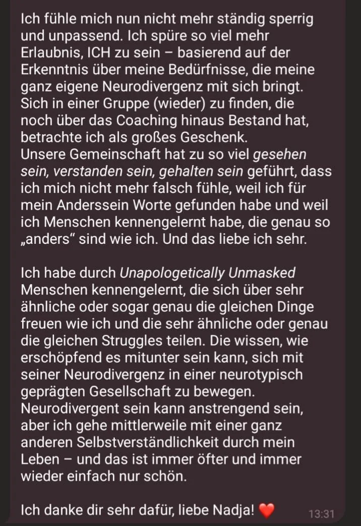 In regelmäßigen Coaching Calls sprechen wir über diese Geschichte, deine Erfahrungen und dein persönliches Erleben deiner Neurodivergenz.